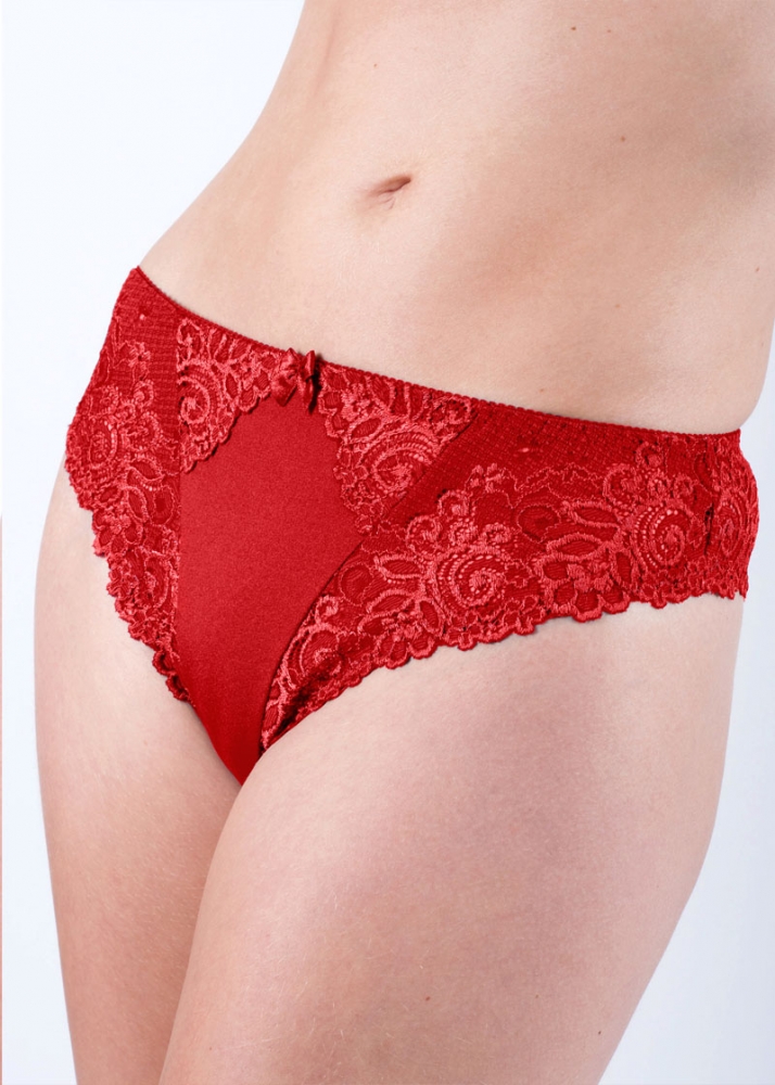 Dominique stringtrosa. Stringtrosan har ett vackert mönstrat tyg och en superskön passform. Framsidan av stringtrosan är dekorerad med en söt rosett. Material: 85% polyamid & 15% elastan.